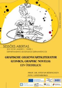 No âmbito do Mestrado em Estudos Alemães Transnacionais, co-financiado pela União Europeia, realizar-se-á nos próximos dias 20 e 22 de janeiro às 10h00 no Departamento de Estudos Germanísticos as sessões abertas «Grafische Gegenwartsliteratur (Comics, Graphic Novels): ein Überblick» . As sessões serão ministradas pelo Prof. Dr. Stefan Börnchen (Uni. Luxemburg), e é organizada por J. Carlos Teixeira (FLUP/CITCEM/CETAPS) em colaboração com o DEG e o programa TNGS. A entrada é livre e não requer inscrição.