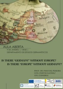 No âmbito do Mestrado em Estudos Alemães Transnacionais, co-financiado pela União Europeia, realizar-se-á no próximo dia 9 de janeiro às 13h30 no Departamento de Estudos Germanísticos a aula aberta «Is the “Germany” without Europe? Is there “Europe” without Germany?». A aula será ministrada pelo Prof. Dr. Pascoal Pereira (Universidade Portucalense/Universidade de Coimbra), e é organizada por J. Carlos Teixeira (FLUP/CITCEM/CETAPS) em colaboração com o DEG e o programa TNGS. A entrada é livre e não requer inscrição.
